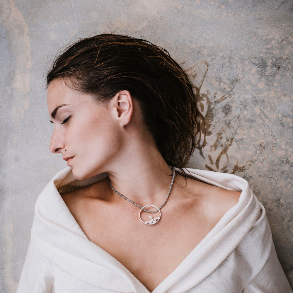 Le collier de la collection Abysse est réalisé à la main par Emmanuelle Hamet au cœur de son atelier de bijouterie.